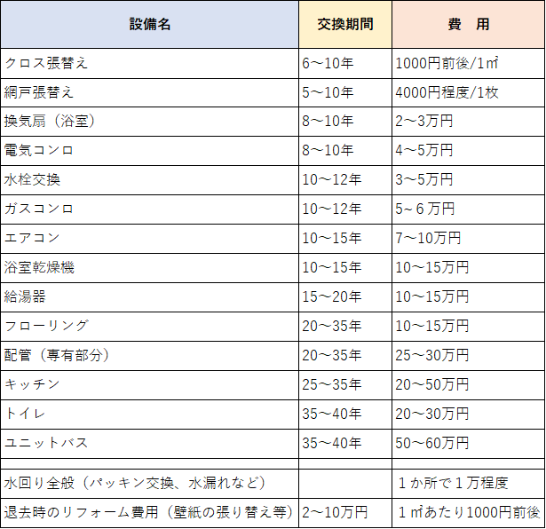 エアコンや浴室乾燥機、給湯器、ガスコンロ、水栓などは一定期間で寿命がくるので定期的に交換する必要があります。以下に設備などの交換期間の目安とおおよその費用をまとめておきましたで、投資シミュレーションの参考にしてください。
